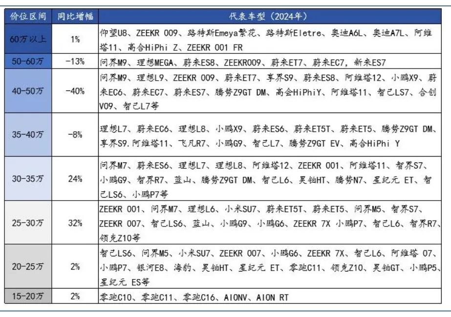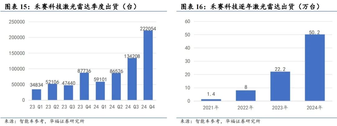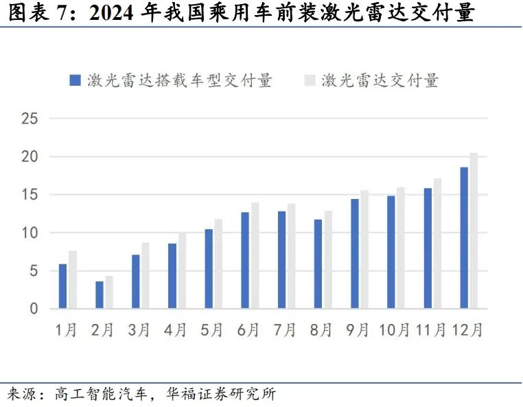 智驾平权将带来激光雷达需求的台阶式增长。根据中国汽车工业协会数据,2024年新能源乘用车中,目前销量仍主要集中在10-20万价格区间,2024年累计销量559.9万辆,同比增长120.9%。数据表明,10-20万级别的新能源汽车是市场的主流消费区间,拥有庞大的消费群体。因此,若激光雷达在此区间车型上实现标配,市场普及速度将快速提升,并打开巨大的市场发展空间。