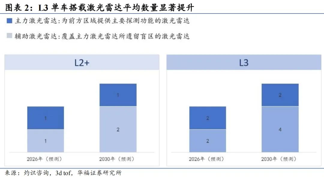 L3对功能的强安全、对硬件强制备份、冗余的要求,让激光雷达有望成为L3自动驾驶的必备传感器。L2 车型通常只配备一个低成本前向激光雷达;L3级自动驾驶因需安全冗余,会配备多颗激光雷达以实现360度或270度覆盖;L4级预计需前向后向两颗长距激光雷达,周边4 - 6颗补盲雷达,以确保360度全覆盖。因此高级别自动驾驶的加速落地将使激光雷达需求加速增长。