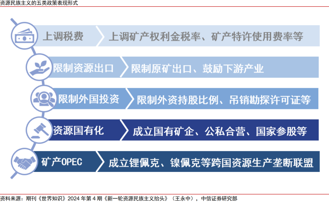 ▍路径一:资源民族主义蔓延,或有更多资源国收紧对关键矿产的供给约束政策,或将尤其给供给国别集中度高的小金属矿产的供给预期带来频繁扰动。