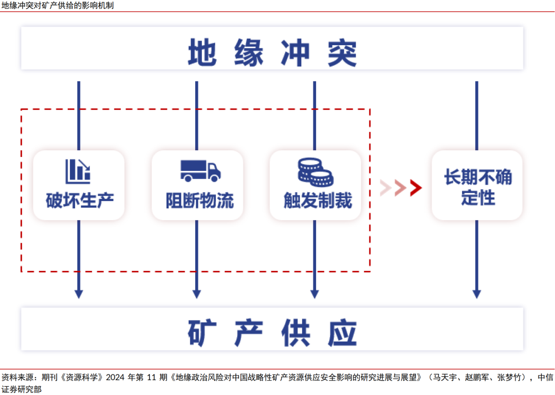 ▍路径三:全球地缘环境不确定性增强、热点地区冲突频发,或将支撑以黄金为代表的避险资产配置需求,并给部分矿产的供给预期带来阶段性扰动。