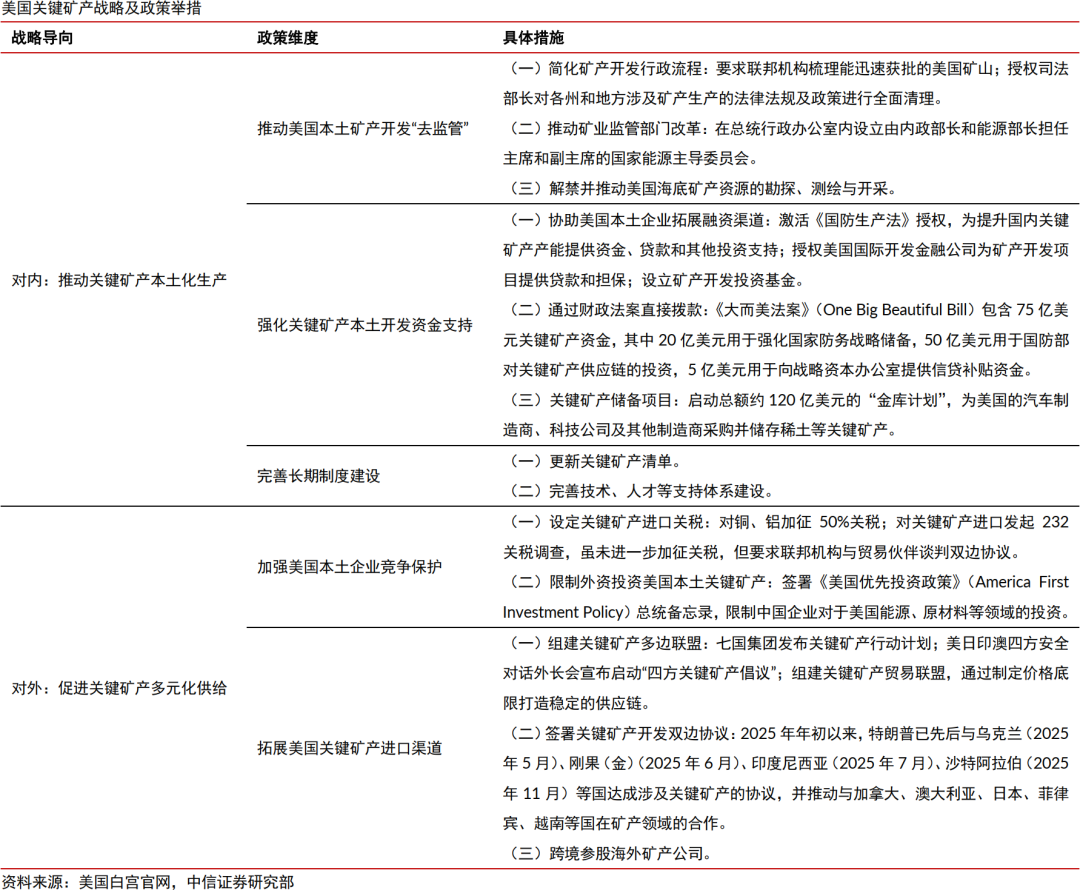 以美国为例,自特朗普重返白宫以来,美国的关键矿产战略已基本形成两条政策主线:对内以放松审批和加强资金支持为抓手,对外以关税和矿产联盟为主要工具,核心目标均指向保障美国关键矿产供应的安全性。
