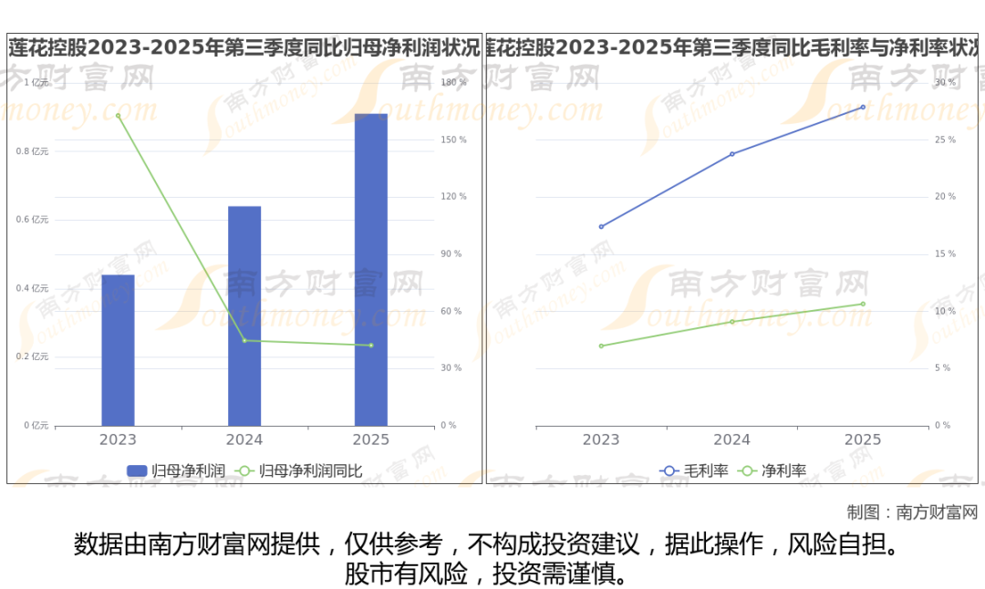 公司2025年第三季度季报显示,莲花控股实现净利润9145.73万,同比增长42.23%;毛利润为2.43亿,毛利率27.88%。