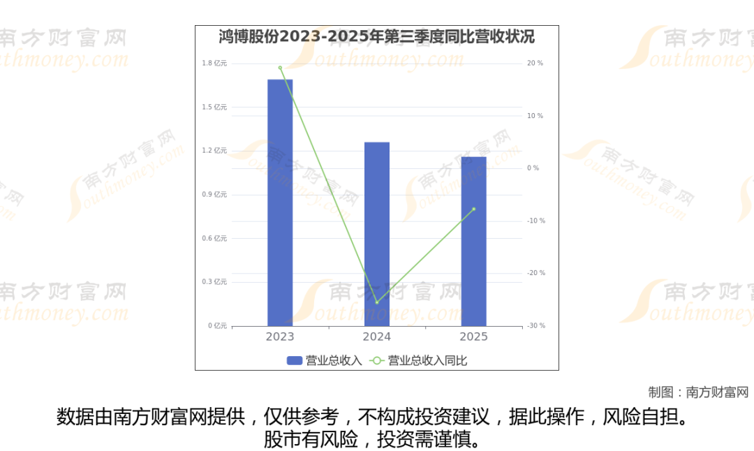 鸿博股份2025年第三季度报告显示(如上图),公司实现主营业务收入1.16亿元,较去年同期增长-7.72%。