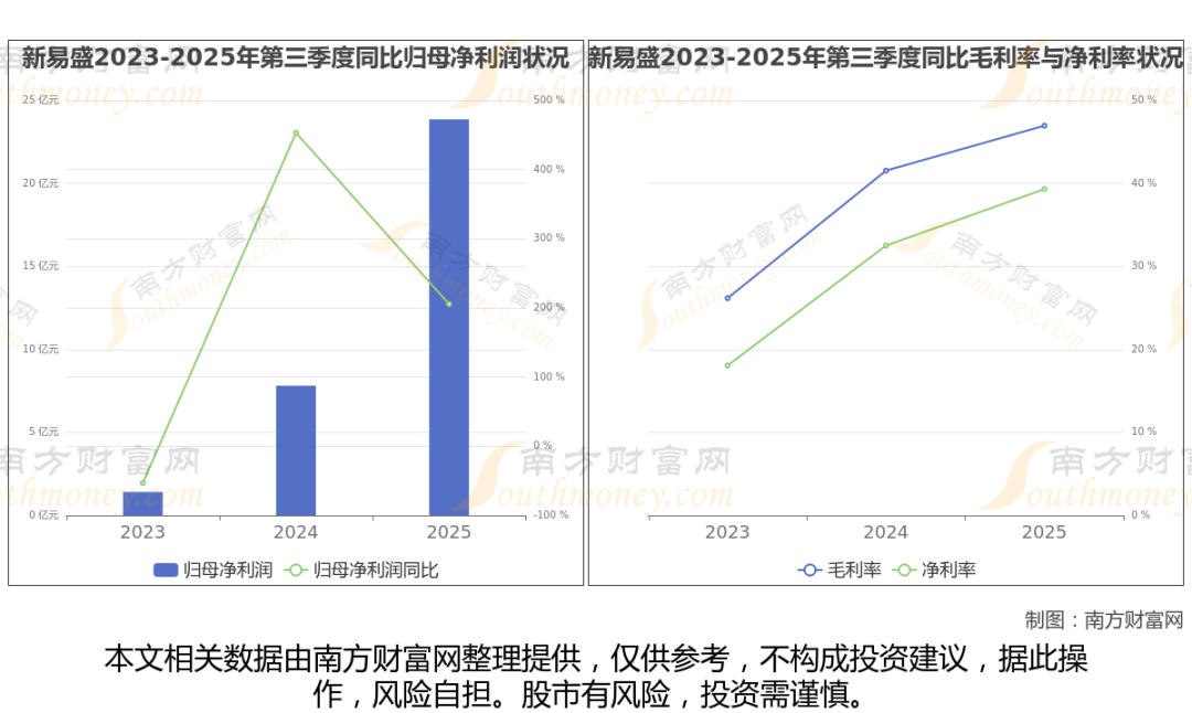 2025年第三季度季报显示,新易盛公司毛利率46.94%,净利率39.3%,归属净利润23.85亿,同比增长205.38%。