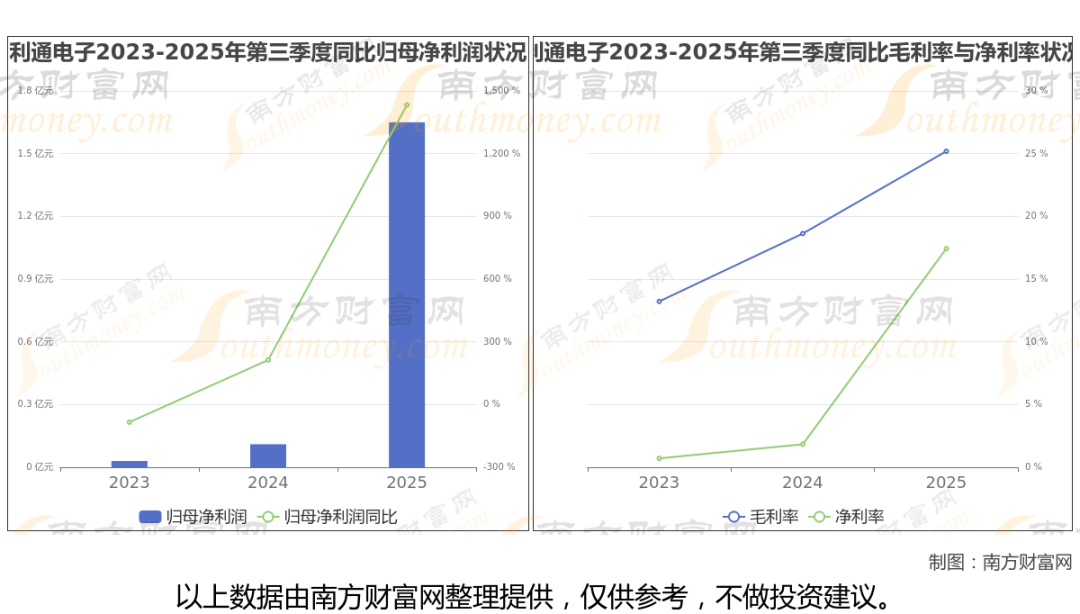 2025年第三季度季报显示,利通电子公司实现净利润1.65亿,同比上年增长率为1432.9%,毛利率25.19%。