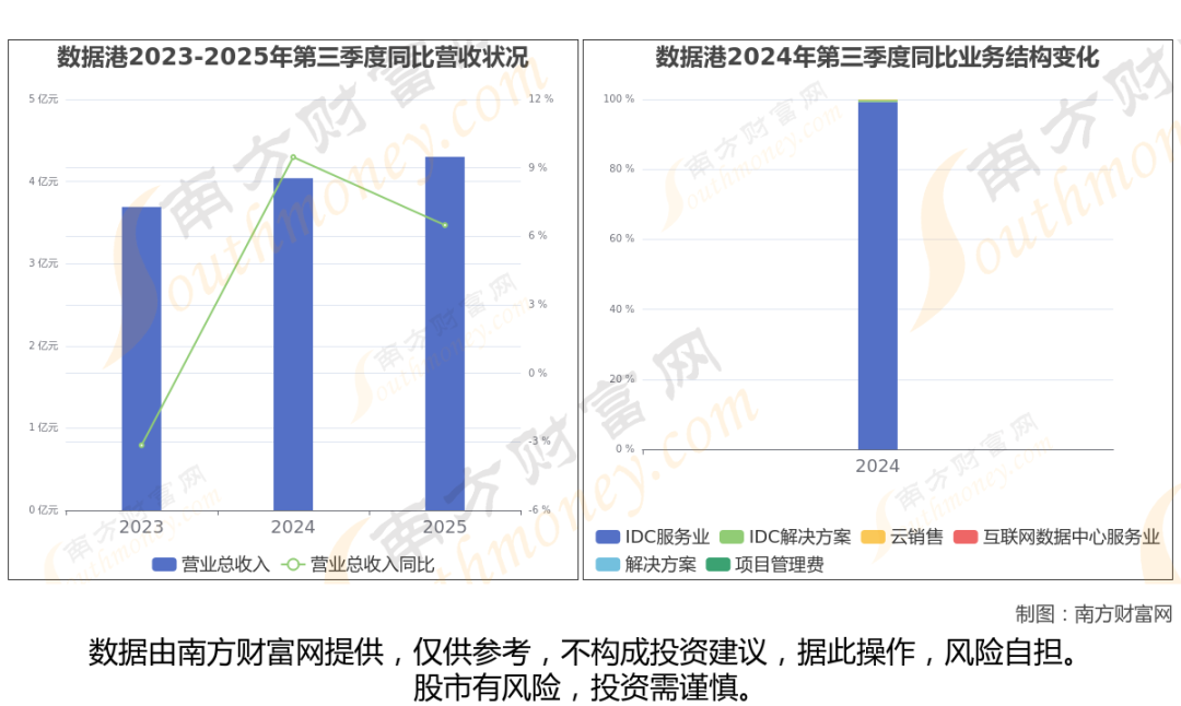 数据港2025年第三季度报告显示(如上图),公司实现主营业务收入4.3亿元,较去年同期增长6.49%。