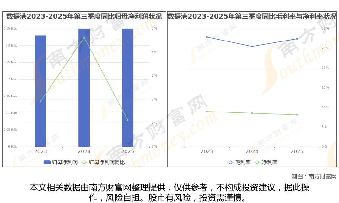 2025年第三季度季报显示,数据港公司实现净利润3489.72万,同比上年增长率为1.13%,毛利率27.39%。