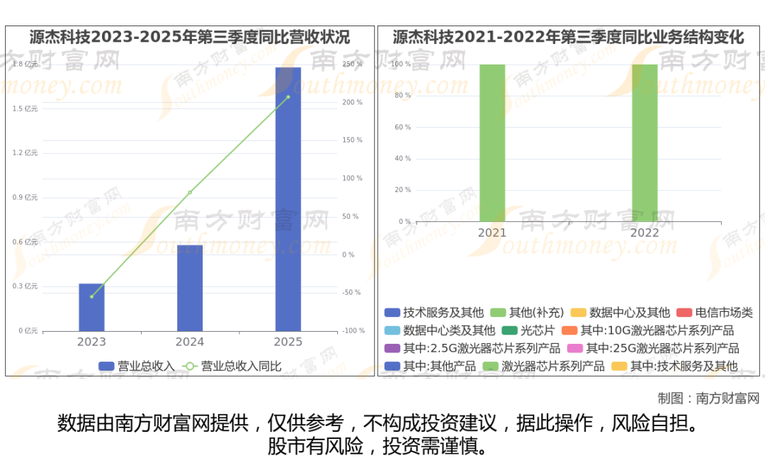 源杰科技2025年第三季度报告显示(如上图),公司实现主营业务收入1.78亿元,较去年同期增长207.31%。