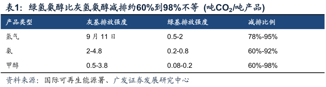 在“1.5℃情景”约束下,绿氨和甲醇正成为难减排行业能源转型的关键载体。根据国际可再生能源署,到2050年实现1.5℃目标的基础在于可再生能源、提高能源效率以及广泛电气化,其中通过可再生能源驱动的水电解制取的绿色氢气及其衍生物也将发挥关键作用。绿氢氨醇比灰氢氨醇减排约60%到98%不等,有望在能源系统脱碳方面发挥关键作用。