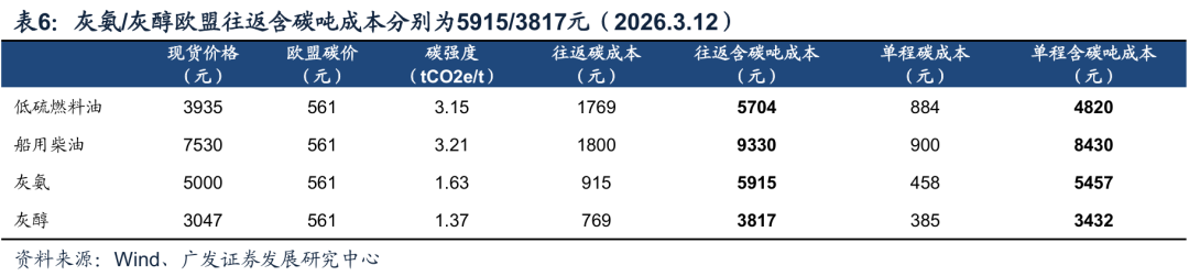 根据欧盟碳关税标准,灰氨、灰醇碳强度分别为1.63、1.37tCO2e/t,按碳排放指数70.55欧元/吨(561元人民币/吨,3月12日价格)计算,往返碳成本高达915、769元每吨。对应含碳价格可达5907元、3811元/吨(不计算碳强度惩罚,仅计算基础碳成本)。