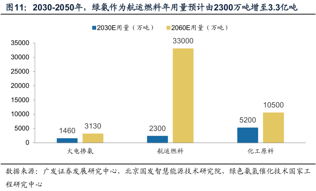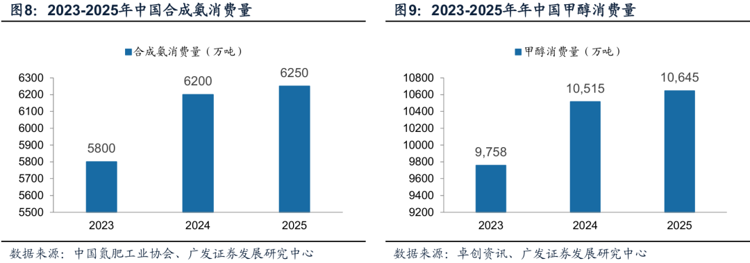 传统氨和甲醇已是成熟大宗品,“替代 增量”双逻辑拉动绿色燃料需求。据中国氮肥工业协会统计,2025 年中国合成氨消费量6280万吨。根据卓创资讯,2025 年中国甲醇消费量1.064亿吨,氨和甲醇作为基础化工原料已经有着较大的消费基数。在节能减排和能源安全思想推动下,作为清洁燃料选项的氨与甲醇将获得更多的需求。