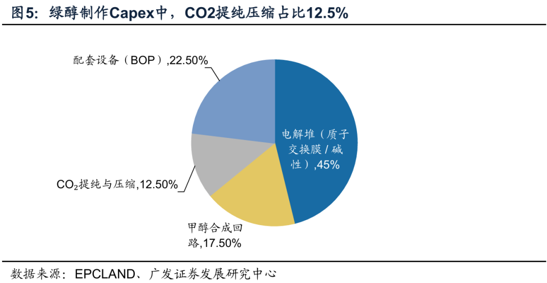 绿氢占电制甲醇成本结构据绝对主导,碳源选择带来差异化优势。总成本结构看,根据EPCLand,电制甲醇总成本约4913元/吨,其中绿氢成本占比75%(约4000元/吨),CO₂捕集成本占比12.5%(约463元/吨)。单位投资成本看,传统煤制合成氨约1.5-2.5万元/吨年产能,煤制甲醇约0.8-1.5万元/吨年产能。相比之下,绿色甲醇约1.8-2.2万元/吨年产能。CAPEX看,电解槽CAPEX在产品总成本中占比高达47.5%,甲醇合成回路、CO₂提纯压缩、配套设备分别占17.5%/12.5%/22.5%。降本路径看,绿醇降本同样依赖绿电价格下行,但若采用低成本的工业尾气或生物质发酵碳源,捕集成本可低至180-290元/吨,相比直接空气捕集(2160元/吨以上)可大幅压缩CO₂捕集成本,形成差异化优势。