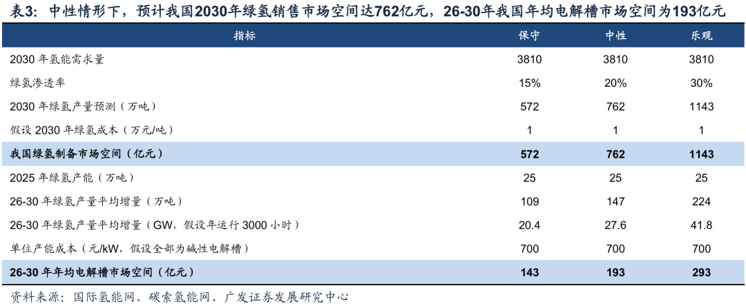 根据中石化经研院预测,2030年我国氢能需求达3810万吨。我们假设在保守/中性/乐观情形下,绿氢在其中渗透率达到15%/20%/30%。根据前文对绿氢成本预测,假设2030年绿氢制备成本下降至10元/kg(即10000元/吨)。保守/中性/乐观情形下,预计我国2030年绿氢销售市场空间达572/762/1143亿元。根据25M1国家能源局新闻发布会,截至2025年底,我国可再生能源制氢项目累计建成产能超25万吨/年。则在保守/中性/乐观情形下,26-30年年均增加绿氢产能109/147/224万吨,假设单位绿氢产能成本为700元/kW,对应26-30年年均电解槽市场空间为143/193/293亿元。