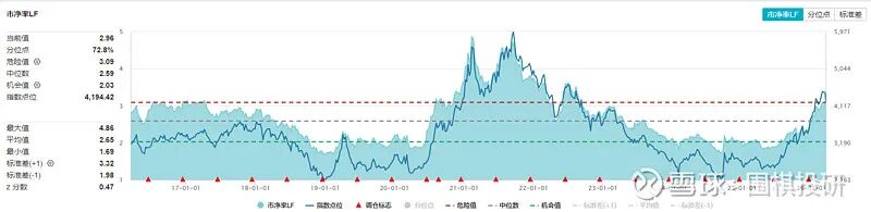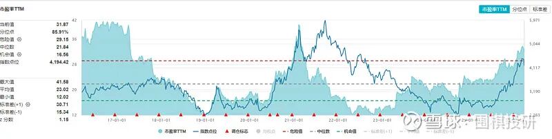 两张图大概是这样看:蓝色线是股价,蓝色阴影面积是估值,三根虚线是分位数,越靠近红色虚线说明所处历史分位点越高。