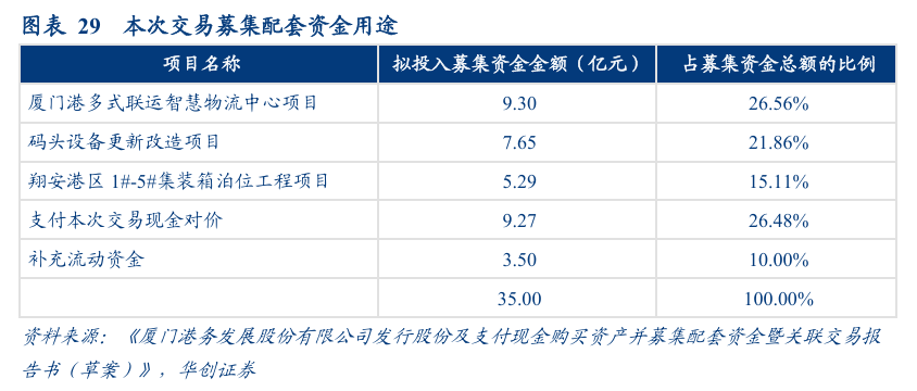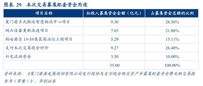 2)募集配套资金:发行股份募集配套资金不超过35亿元,除支付本次交易现金对价外,还将用于厦门港多式联运智慧物流中心项目、码头设备更新改造项目、翔安港区 1#-5#集装箱泊位工程项目以及补充流动资金,目前发行股份数量和价格尚未确定。
