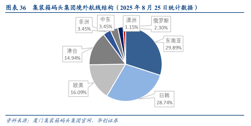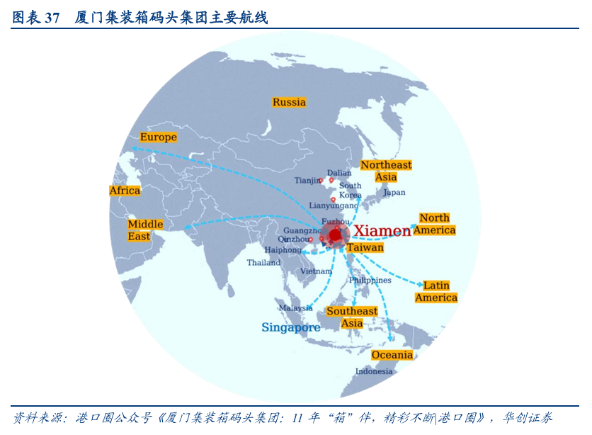 我们对厦门集装箱集团航线表中的具体航线进行统计: 厦门集装箱码头集团境外主要航线分布,东南亚航线26条,占比30%,排名第一;日韩航线25条,占比29%,排名第二;中国港台地区航线13条,占比15%。得益于福建省与中国台湾地区、东南亚、日韩的密切经济往来,厦门集装箱码头与上述亚洲地区航线合计占比高达74%,预计将长远受益于两岸经济融合发展及RCEP区域全面经济伙伴关系协定全面实施。