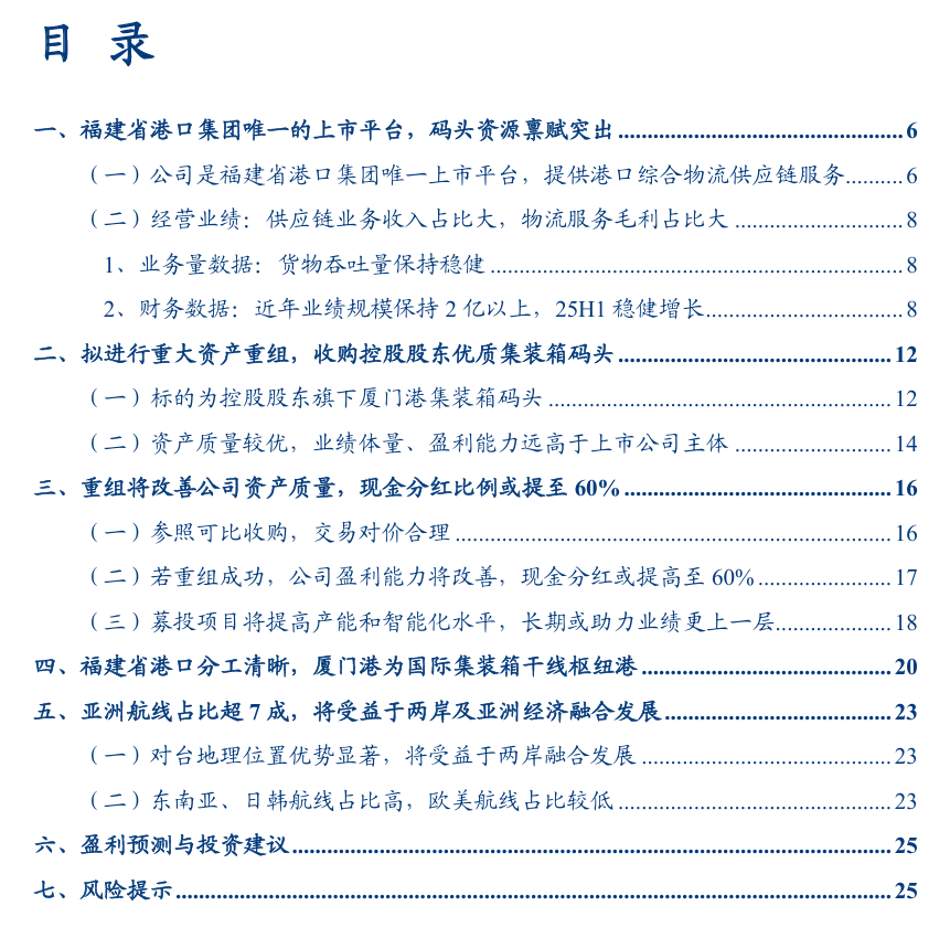 1、盈利预测:由于上述重大资产重组事项尚未完成交易,我们暂不考虑集装箱资产盈利预测纳入。考虑到近年公司港口物流业务增长较为稳健,我们假设2025-27年公司港口物流板块营收分别 4.6%、 4%、 4%,毛利率分别为19.9%、19.8%、20%;由于全球政治经济环境深刻变化下贸易环境短期内存在波动和不确定性,且25H1公司港口贸易板块营收同比-16%,我们假设港口贸易板块营收分别同比-8%、 2%、 1%,毛利率分别为1.3%、1.3%、1.5%,对应公司2025-27年实现归母净利分别为2.17、2.31、2.64亿元,对应EPS分别为0.29、0.31、0.36元,PE分别为28、27、23倍。