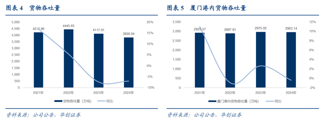 2024年,公司实现货物吞吐量3830.04万吨,同比减少6.97%,主要是厦门港内的铁矿石、荒石、钢材及厦门港外的内贸机制砂等货种的装卸需求减少。