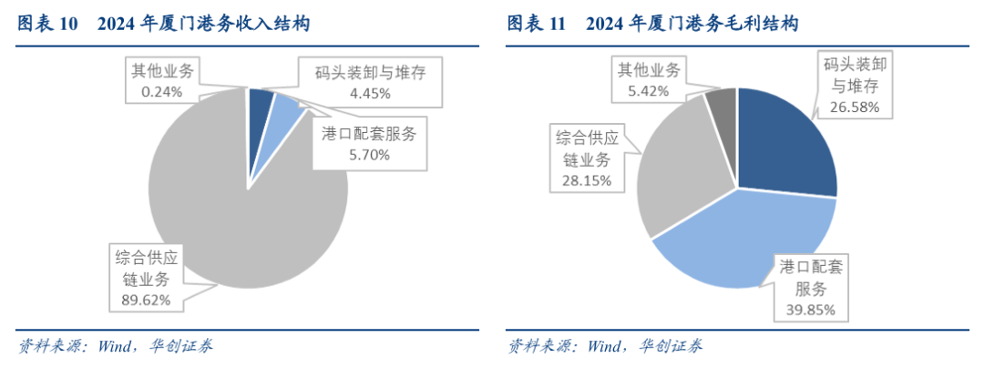 营业收入结构:综合供应链业务占比89.62%,是公司第一大业务板块;港口配套服务占比5.7%,码头装卸与堆存业务占比4.45%,其他业务占比0.24%。