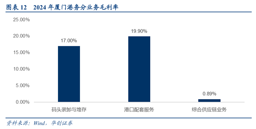 毛利结构:港口配套服务占比39.85%,是公司主要毛利来源;综合供应链业务占比28.15%;码头装卸与堆存贡献26.58%的毛利,其他业务占比5.42%。