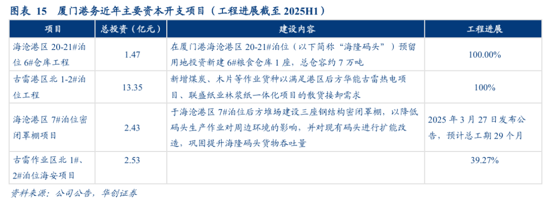 从资本开支状态来看,公司近年主要投资项目包括海沧港区20-21#泊位6#仓库工程、古雷港区北1-2#泊位工程等,其中古雷港区北1-2#泊位工程总投资额达13.35亿元,已于2024年下半年正式投产运营。2025年3月27日,公司发布公告称投资建设海沧港区7#泊位密闭罩棚项目,该项目预计总投资2.43亿元,总工期29个月,此外,公司在建古雷作业区北1#、2#泊位海安项目,上述两个项目为近期公司主要资本开支项目。