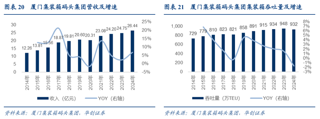本次拟收购标的厦门集装箱码头拥有稀缺的集装箱码头资源,包括海天码头、海润码头、海通码头、嵩屿码头、国际货柜码头等,年通过能力超过1000万标箱,占厦门全港能力的3/4以上。根据2024年集装箱吞吐量,厦门港是全球第14大集装箱枢纽港,中国境内第7大集装箱港口。