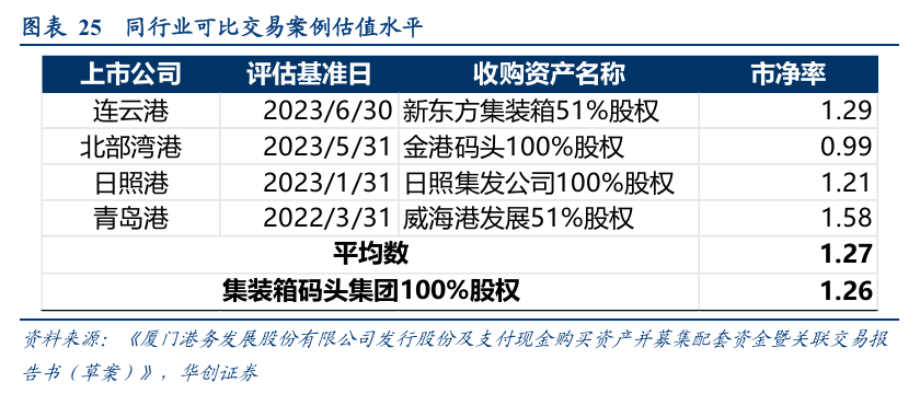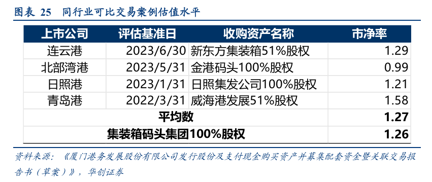 根据厦门港务于2025年8月5日发布《厦门港务发展股份有限公司发行股份及支付现金购买资产并募集配套资金暨关联交易报告书(草案)》,本次交易标的资产作价为61.78亿元,其中现金支付9.27亿元、股份对价52.51亿元,PE对应2024年归母净利润约为15.56 倍,PB为1.26倍(按照2025年3月31日归属于母公司股东的所有者权益计算)。