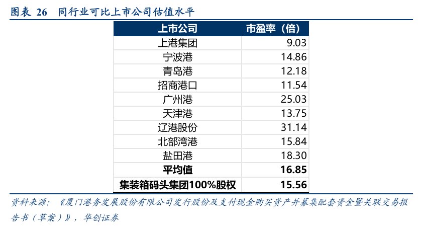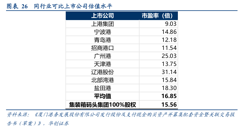 此外,根据《厦门港务发展股份有限公司发行股份及支付现金购买资产并募集配套资金暨关联交易报告书(草案)》,选取与标的公司主营业务相近的可比公司对比PE估值水平,根据公开市场数据,可比公司平均市盈率为16.85倍,标的公司市盈率为15.56倍,标的公司市盈率低于可比上市公司市盈率的平均值。