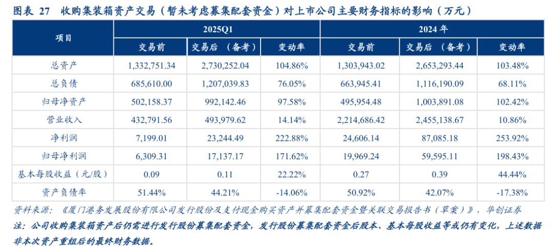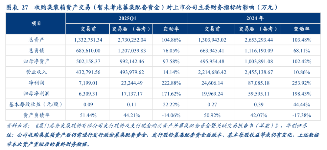 根据《备考审阅报告》,在不考虑募集配套资金的情况下,本次收购集装箱资产交易后上市公司的资产规模及盈利能力将提升。参考2024年以及2025Q1的财务数据,交易完成后,上市公司总资产规模将翻倍,净利润增长超200%,归母净利润将从2亿元的体量增长至6亿元,增长近200%,且资产负债率绝对值将下降超7pct。