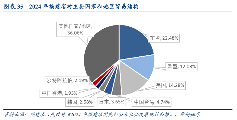 据《2024年福建省国民经济和社会发展统计公报》,2024年福建省对东盟进出口4473.6亿元,同比增长8.4%,在福建省贸易占比达22.48%,目前东盟已经成为福建最大的贸易伙伴。2024年,福建省对东盟贸易总额达4473.6亿元,在全国占比6%;对共建“一带一路”国家实现贸易总额10537.5亿元,占比5%。