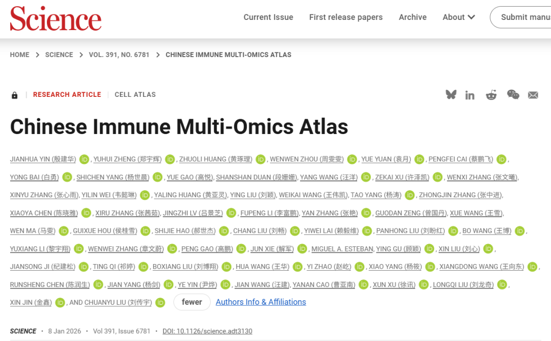 北京时间2026年1月9日,华大生命科学研究院牵头建设的基因组多维解析技术全国重点实验室联合上海交通大学医学院附属瑞金医院、山西医科大学等多家机构在国际顶级学术期刊《科学》(Science)上发布重磅成果。研究团队对428位中国自然人群队列中超过1000万个外周血免疫细胞进行了系统性多组学深度解析,绘制了高分辨率人群免疫多组学图谱(CIMA),这也是全球首个千万级免疫细胞图谱。