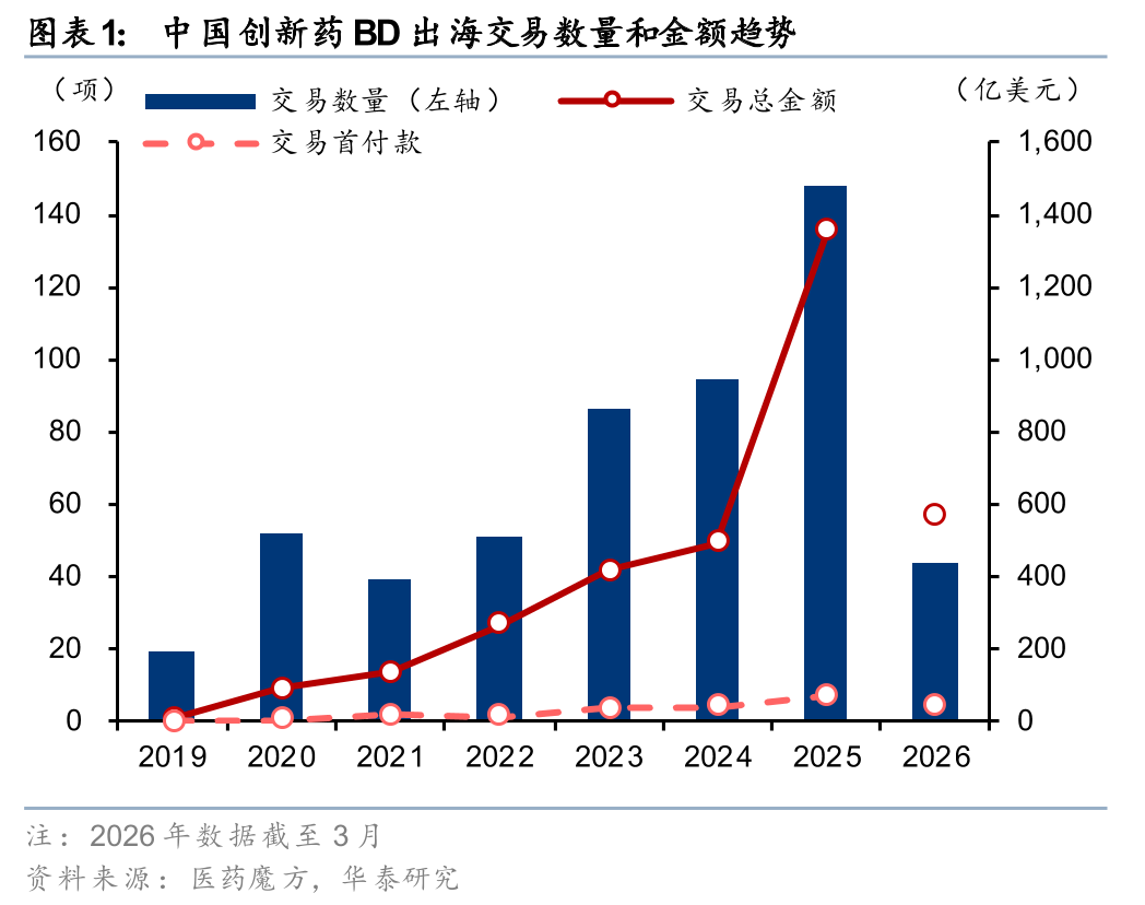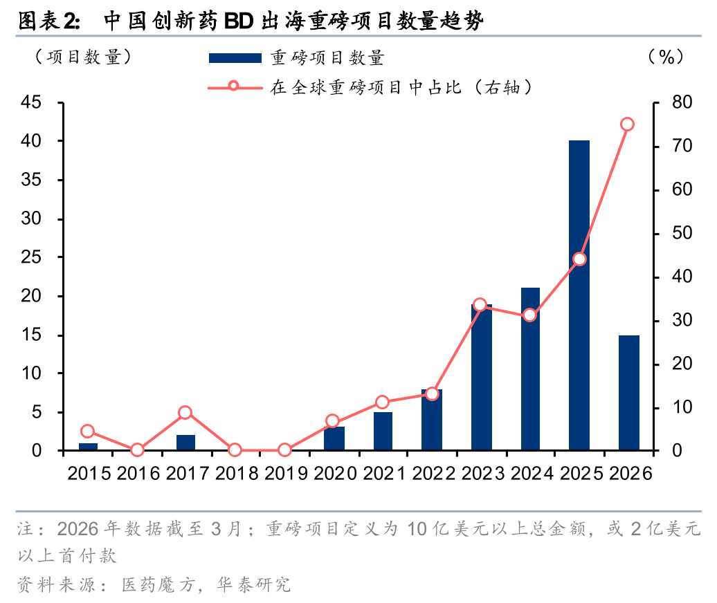 中国创新药行业BD数量及金额今年以来较历年同期再创新高,行业景气度远胜去年。26年以来国产创新药已达成出海BD 45项( 73%yoy),披露总金额575亿美元( 135%yoy)、首付款40亿美元( 1,095%yoy)。从全球视角来看,年初至今国产创新药BD项目数和披露金额的全球占比分别达~20%和~75%;在已达成的21项重磅交易中有15项为中国交易,占比7成以上。市场担心BD的持续性,我们认为,就目前MNC和海外PE机构接触的中国资产数量及行业对中国资产的兴趣增长趋势来看,BD持续增长有较高的可预见性。