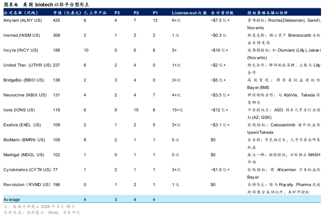 1) 平台型公司的BD是可持续的,并且会成为主要商业模式。与美国Biotech不同,中国创新药公司的平台技术较为丰富,加上研发和临床效率高,成本低,我们认为持续的BD将成为一种主流的商业模式,并且给企业带来持续的现金流和大额利润。美国的情况正相反,我们列举了XBI指数种的权重股,前12名之中,能称得上是平台公司的仅有Anlyam(siRNA平台)和Ionis(ASO平台),各完成了6次和15次BD。单个首付款的金额也和近两年中国的大型BD差距甚远。多数公司只有1~2个核心资产,管线数量从数个到十数个,跟头部中国创新药公司,如恒瑞医药、石药集团及信达生物等具备几十条甚至百余条管线的公司有数量级上的差距;