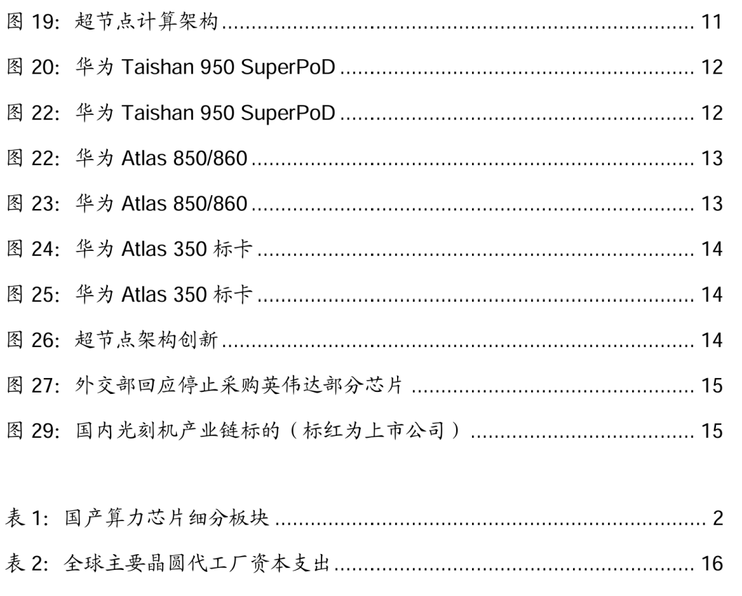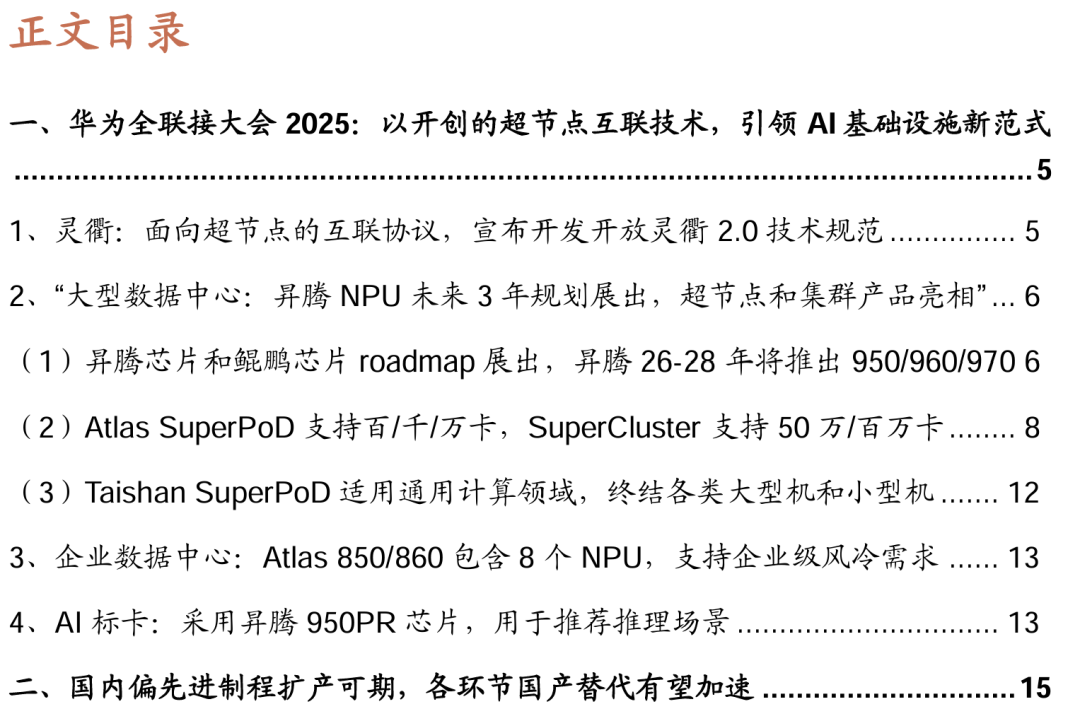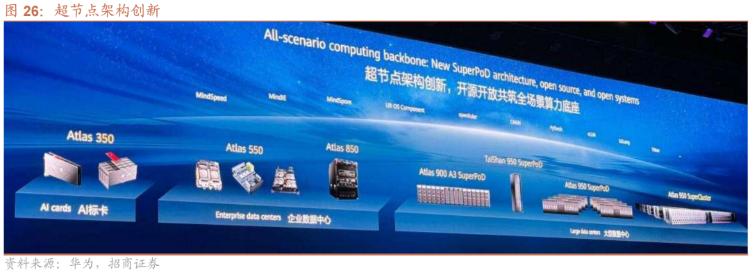华为全联接2025大会以开创的超节点互联技术,引领AI基础设施新范式。会上展示灵衢超节点互联协议,宣布开发灵衢2.0技术规范。硬件方面:1)大型数据中心产品:①昇腾NPU:3年roadmap展出,继25Q1推出910C之后,26-28年将陆续推出950/960/970,950分PR和DT两款,FP8算力1 PFLOPS,均采用自研HBM,960基本是950 2倍算力水平;②鲲鹏CPU:继24Q1推出920之后,预计26Q4/28Q1分别推出鲲鹏950和960;③AI算力节点:Atlas 900 A3 SuperPoD/CloudMatrix384超节点支持384卡互联,采用正交架构实现零线缆电互联,算力规模300 PFLOPS,全液冷数据中心AI超节点Atlas 950/960 SuperPoD可提供8192/15448卡方案(单柜64个NPU,单柜功率100kW),发布了全球最强超节点集群Atlas 950和960 SuperCluster,算力规模分别超过50万卡和达到百万卡,预计分别于26Q4和27Q4上市;④通用计算节点:业界首个通算超节点Taishan 950 SuperPoD,预计26Q1推出,最大16节点,最大内存48TB;2)企业数据中心:Atlas 850/860包含8个NPU,支持企业级风冷需求;3)AI标卡:采用昇腾950PR芯片,用于推荐推理场景。