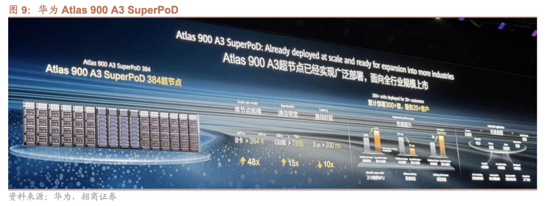 今年,华为已经推出了Atlas 900 A3 SuperPoD超节点,即为CloudMatrix384超节点,最大384卡互联,算力规模300 PFLOPS,至今累计部署300多套,服务于互联网、金融、运营商、电力、制造等行业的20多个客户。
