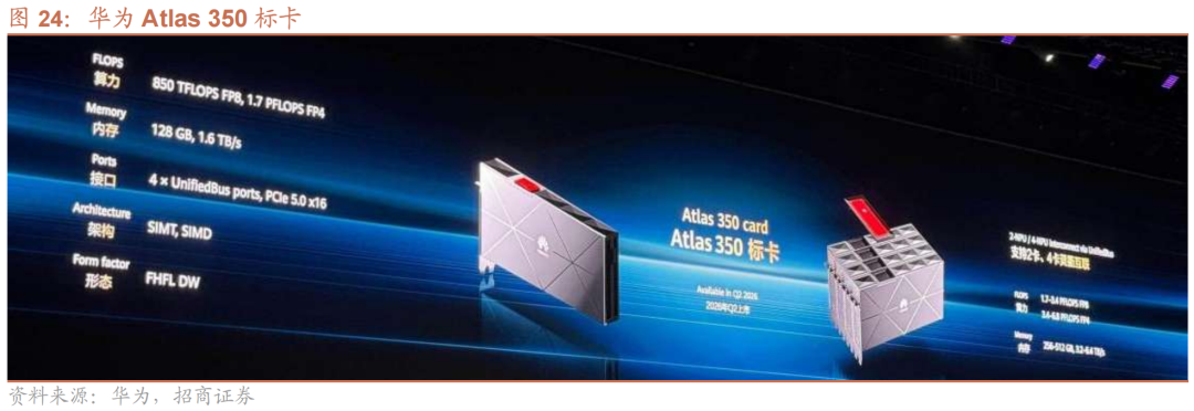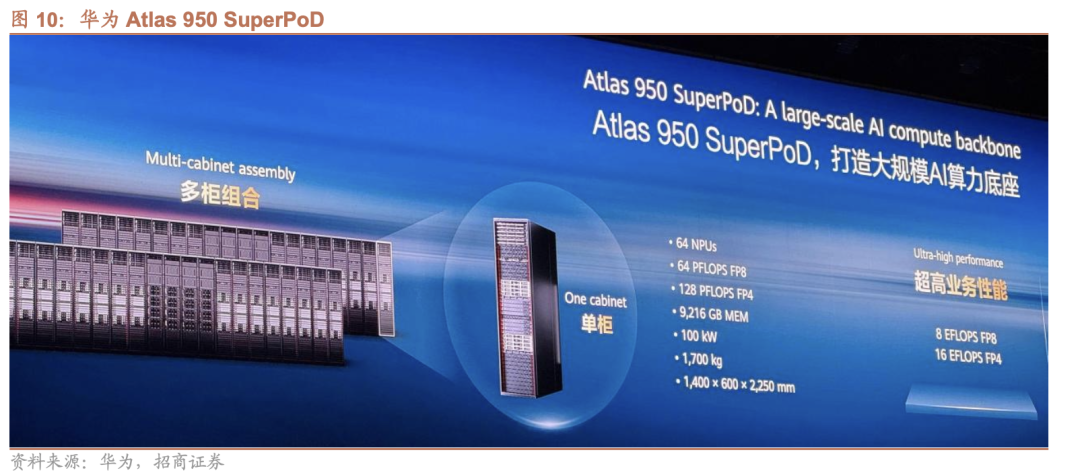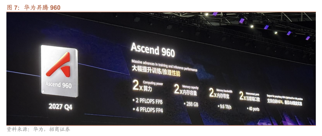 3)昇腾970:预计28Q4推出,支持数值类型和960相同,互联带宽高达4 TB/s,FP8算力高达4 PFLOPS,内存容量288GB,内存带宽14.4 TB/s。