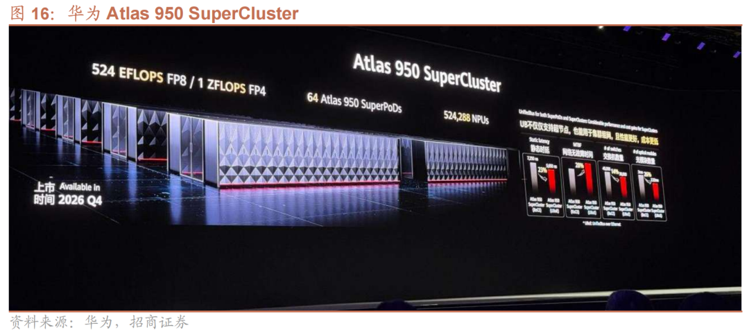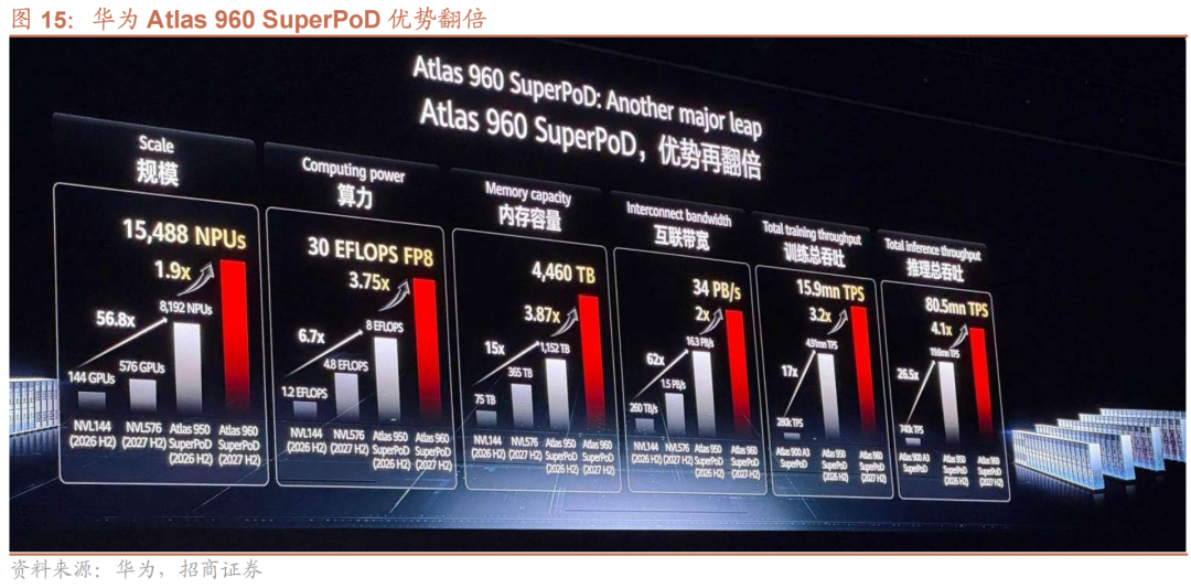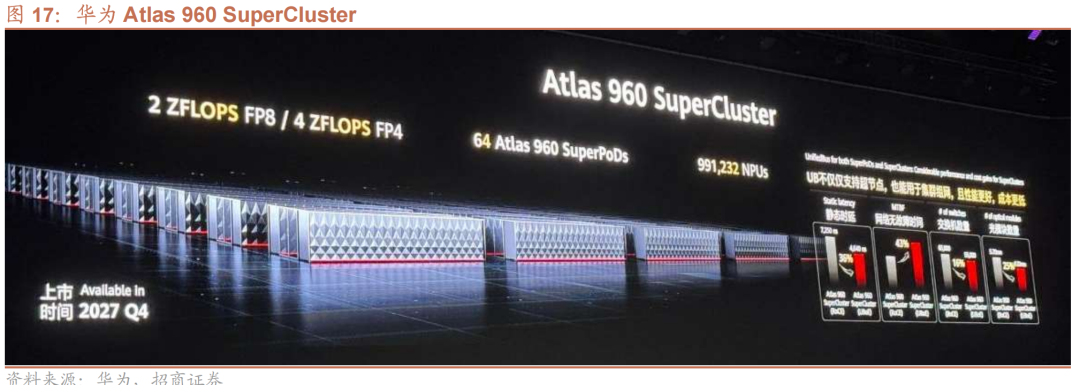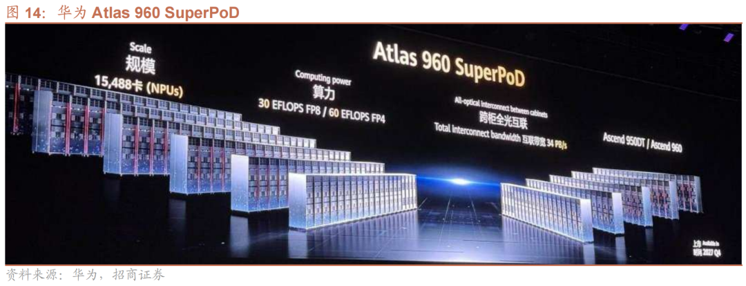 Atlas960 SuperPoD支持15448卡NPU,合计FP8算力达30 EFLOPS,可实现跨柜全光互联,总互联带宽34 PB/s,搭载950DT或960,上市时间27Q4。