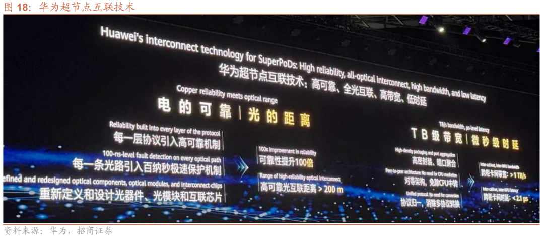 华为超节点互联技术:高可靠、全光互联、高带宽、低时延。华为超节点具备电的可靠和光的距离,重新定义和设计光器件、光模块和互联芯片,可靠性提升100倍,高可靠光互联距离大于200m,实现TB级带宽和微秒级时延。
