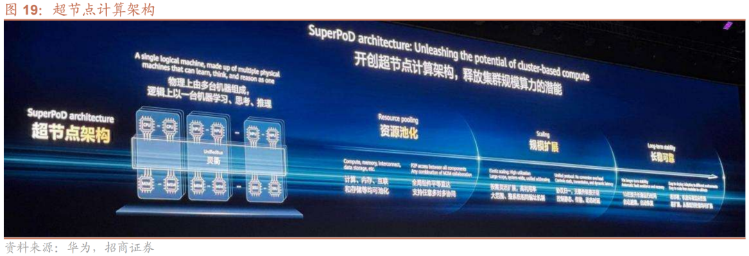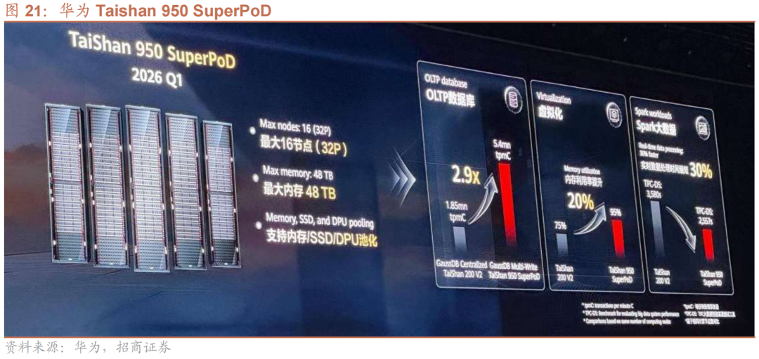 TaiShan 950 SuperPoD预计26Q1推出,最大16节点,最大内存48TB,是华为推出的业界首款通算超节点,具备370纳秒超低时延、2.8T超大带宽和内存池化能力,能大幅提升数据库、虚机热迁移和大数据场景等业务性能,为通算性能提升开辟全新路径。华为率先把超节点技术引入通用计算领域,发布全球首个通用计算超节点TaiShan 950 SuperPoD,结合GaussDB分布式数据库,能够彻底取代各种应用场景的大型机和小型机以及Exadata数据库一体机,将成为各类大型机、小型机的终结者。
