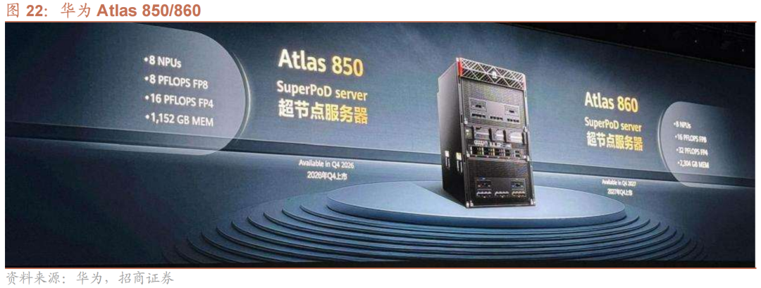 AI超节点服务器Atlas 850和Atlas 860支持企业级风冷需求。Atlas 850,是业界首个企业级风冷AI超节点服务器,内部搭载8张昇腾NPU,有效满足企业模型后训练、多场景推理等需求。Atlas 850支持多柜灵活部署,最大可形成128台1024卡的超节点集群,是目前业内唯一可在风冷机房实现超节点架构的算力集群。Atlas 850超节点服务器预计26Q4上市,Atlas 860超节点服务器预计27Q4上市,均包含8个NPU。
