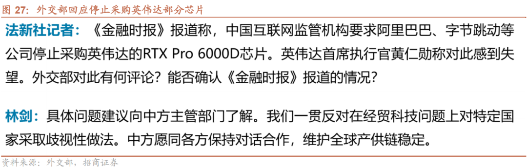 中美博弈背景下,本土AI算力芯片实力逐步提升。9月18日,外交部发言人林剑主持例行记者会,法新社记者提问“《金融时报》报道称,中国互联网监管机构要求阿里巴巴、字节跳动等公司停止采购英伟达的RTX Pro 6000D芯片”。中方表示一贯反对在经贸科技问题上对特定国家采取歧视性做法,愿同各方保持对话合作,维护全球产供链稳定。英伟达此前也表示只有在地缘政治解决的前提下才有望实现25Q3 H20 20-50亿美元的收入。