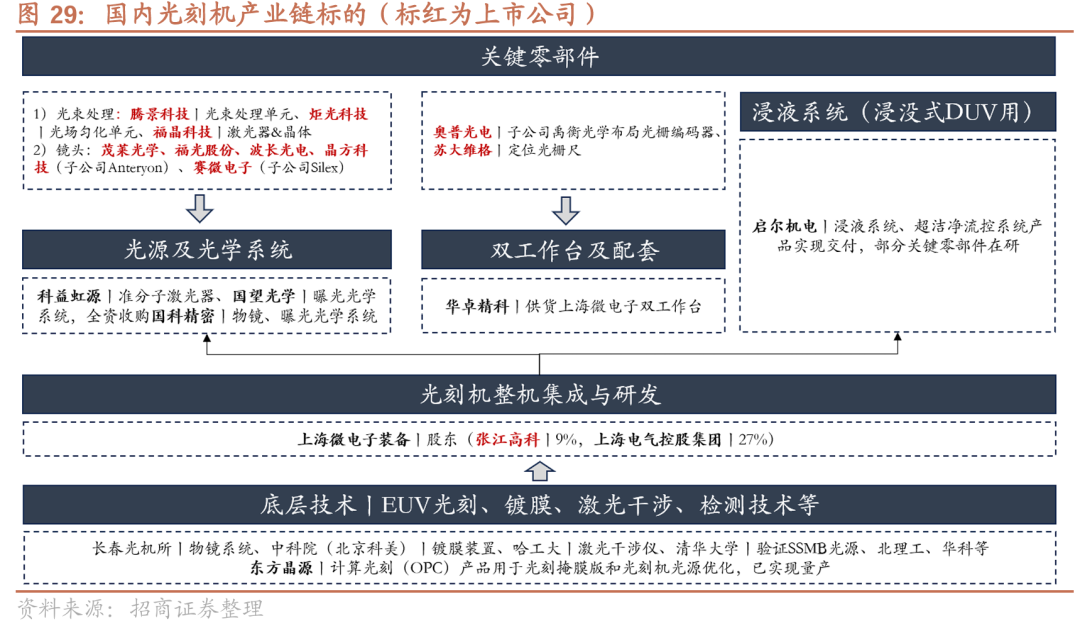 国内光刻机产业链持续聚焦整机及光学、工作台、浸液系统等相关零部件,自主可控需求赋能长期成长。国家此前于2008年启动02专项即“极大规模集成电路制造装备及成套工艺”专项,以建立自主的高端光刻技术和产业发展能力,聚焦28nm浸没式光刻机和极紫外光刻技术,针对不同细分环节,“02专项”设立了如光源、曝光光学系统、双工作台系统、浸液系统、核心零部件等的子项目,若国产DUV整机落地,或将解决光刻机过度依赖ASML掣肘,加速自主可控需求并赋能产业链增长。