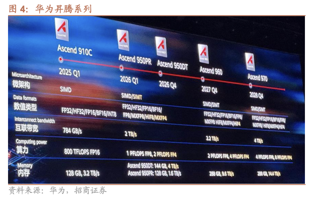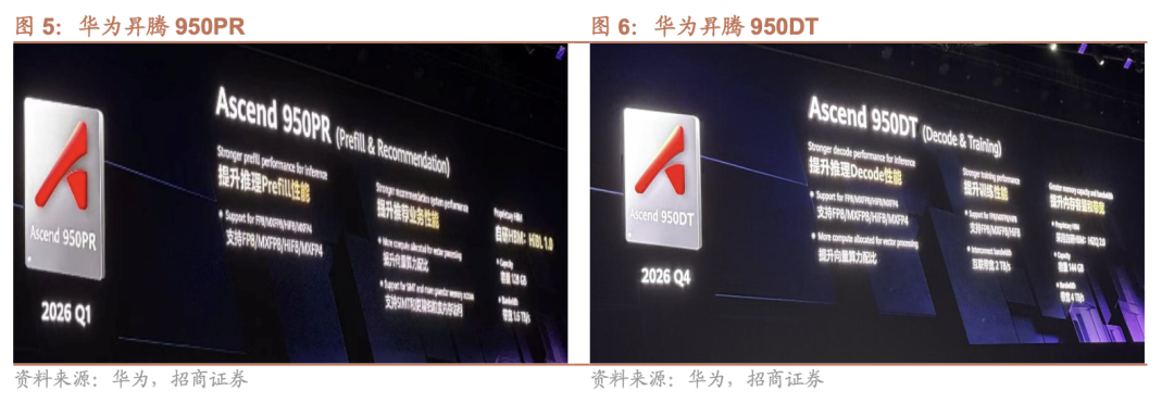1)昇腾950:包括950PR和950DT。950PR(Prefill & Recommendation)预计于26Q1推出,旨在提升推理Prefill性能,支持FP8/MXFP8/HiF8/MXFP4,有助于提升推荐业务性能,该产品采用了华为自研HBM HiBL 1.0。950DT(Decode & Training)预计于26Q4推出,提升了推理decode性能,也提升了训练性能,互联带宽达2 TB/s,提升了内存容量和带宽,采用自研HBM HiZQ 2.0,容量达144GB,带宽达4 TB/s;