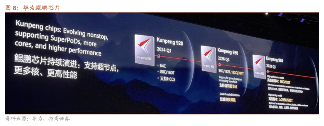 华为在CPU环节展示了鲲鹏CPU,鲲鹏芯片持续演进,支持超节点、更多核、更高性能。鲲鹏920已经于24Q1推出,鲲鹏950预计于26Q4推出,支持通算超节点,双线程灵犀核。鲲鹏960预计28Q1推出,有高性能版本和高密版本。