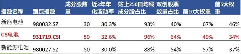 从概念含量来看,CS电池指数聚焦众多电池概念,可以通过指数紧跟热点投资,其中锂电池概念权重占比达到61.2%、储能概念权重占比达55.7%、固态电池权概念重达45.3%。与A股市场上另外两个电池指数对比来看,CS电池指数科创板、创业板股票占比更高为64%,同时前5大、前10大权重更低带来了中小市值的更高权重,指数具备更高的弹性,近3年年化波动率32.6%,高于另外两个电池指数。250日均线被誉为“牛熊分界线”,CS指数成分股占上250日均线的比例为96%,也就是“牛股”占了更大的比例。