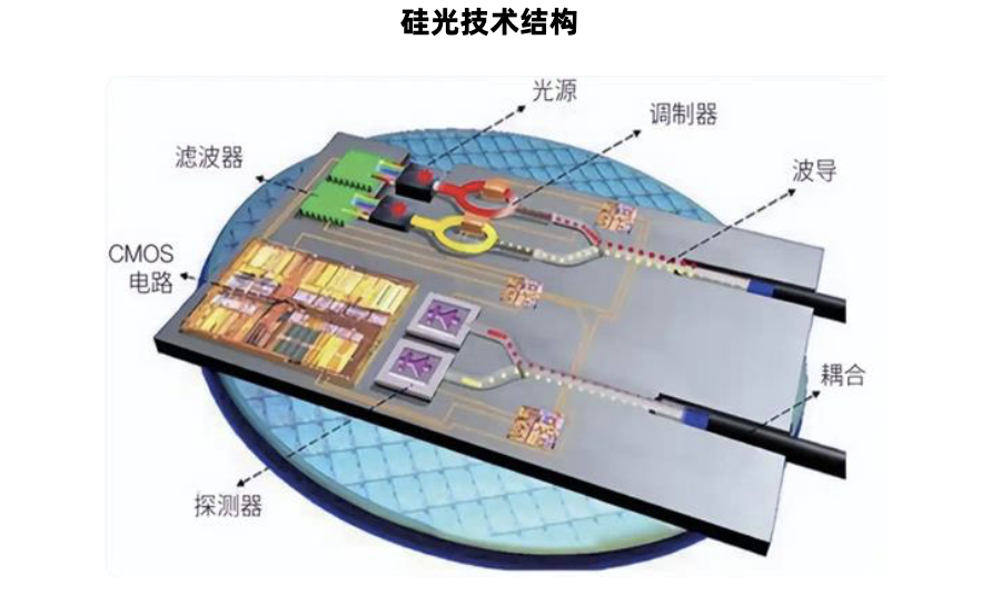 硅光是用半导体技术参与光模块生产的技术,基于硅和硅基衬底材料,利用现有CMOS工艺进行光器件开发和集成的新一代技术。