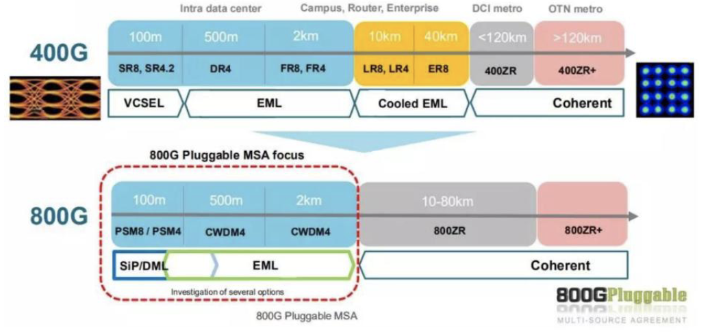 目前大部分主流客户需要的是70mW的CW光源产品,这类功率水平已能满足400G和800G硅光模块的需求。100mW的CW光源产品不仅可用于400G硅光模块,还可应用于800G及1.6T的硅光模块,为更高速率的光通信提供支持。800G开始,硅光方案渗透已初见端倪: