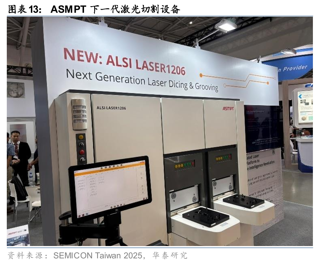 展会上,ASMPT介绍了公司混合键合设备和下一代激光切割设备,展示了其在先进封装设备领域的竞争优势。1)混合键合方面,公司布局LITHOBOLT™系统,能够有效服务AI芯片、高性能计算和5G等高增长细分市场;2)激光切割设备方面,根据公司官网,LASER1206平台的多材料兼容性(包括SiC、GaN等化合物半导体)以及可扩展至6台设备的产线集成能力,显示公司正积极抢占先进封装这一快速增长的市场机会。