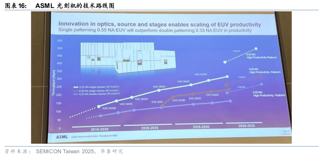 ASML在论坛上指出,公司现有EUV产能持续扩张,多重曝光技术不断提升性能;并计划于2025-2030年推出下一代high-NA EUV,有望推动2nm以下工艺发展,单台设备产能或将显著提升。