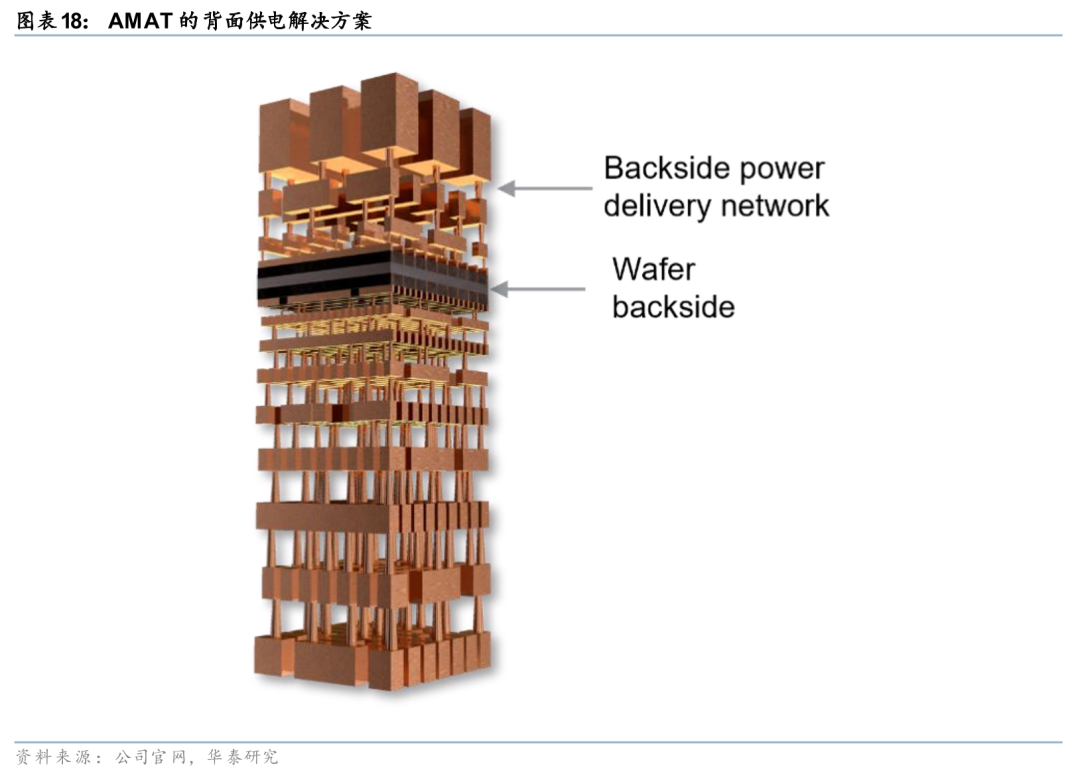 AMAT在展会上表示,背面供电正成为逻辑芯片发展的必然趋势:背面供电通过前端信号线与背面电源线的分离架构,可实现20-30%的IR压降改善,能够大大减少功耗浪费。展会上,AMAT介绍了背面供电的技术路径:从早期的背面电源轨到即将投产的A Power Veer,再到终极的直接背面接触源漏极方案。我们认为,虽然背面供电工艺复杂度高且增加了良率风险,但该技术已成为目前解决功耗问题、提升芯片密度的有效方案。